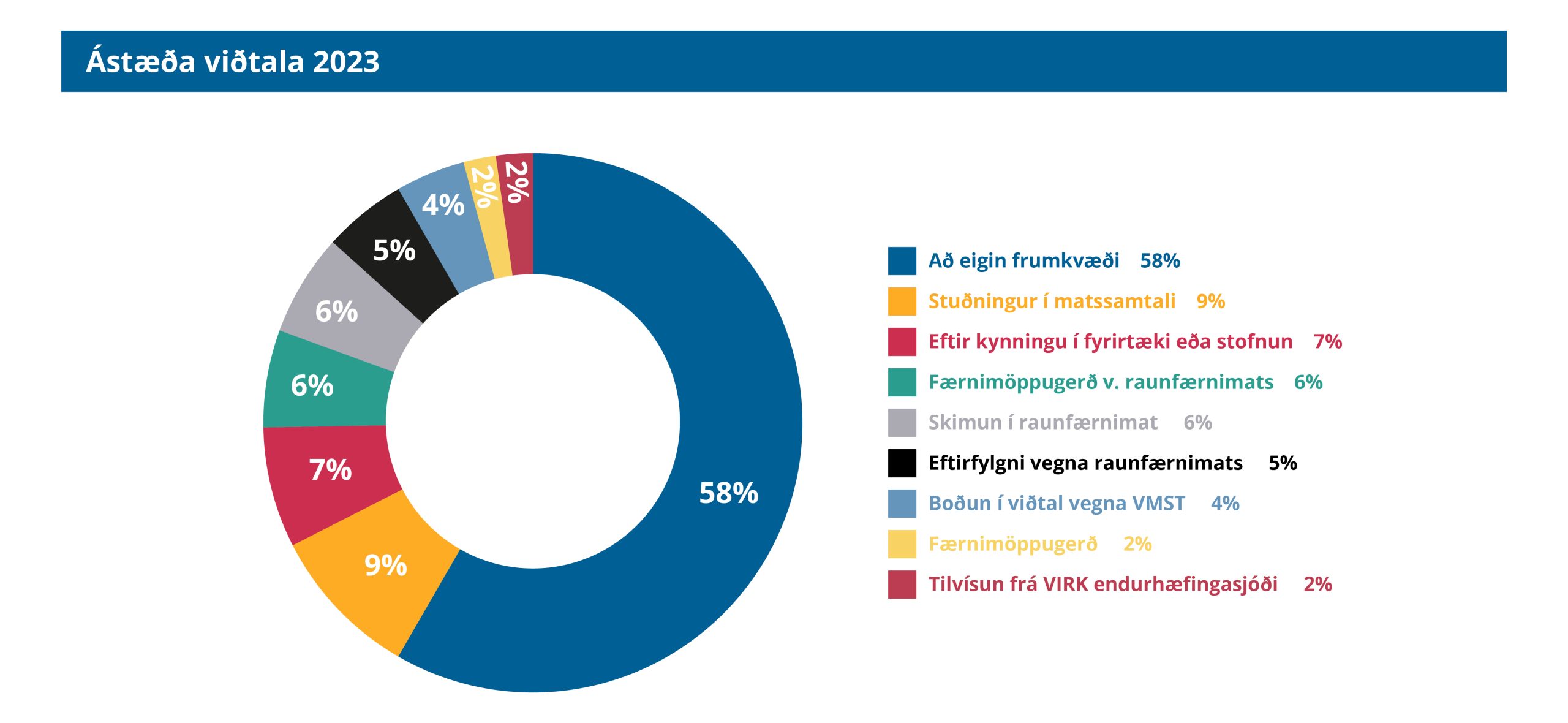 Algengasta inntak ráðgjafarviðtala tengist raunfærnimati, eða um 26% viðtala. Á það við um skimunarviðtal þar sem fólk mátar sig við raunfærnimat í ákveðinni grein; færnimöppugerð, stuðning inni í matssamtali (valkvætt af hálfu þátttakanda) og viðtal að ferli loknu til að taka ákvörðun um næstu skref (eftirfylgniviðtal). Mikið er einnig um að fólk komi til að afla sér upplýsinga almennt um nám og til að leita sér aðstoðar við ferilskrárgerð. Rúmur helmingur þeirra sem kom í viðtal á árinu gerði það að eigin frumkvæði (58%). Minna hefur verið um vinnustaðaheimsóknir af hálfu ráðgjafa undanfarin ár.