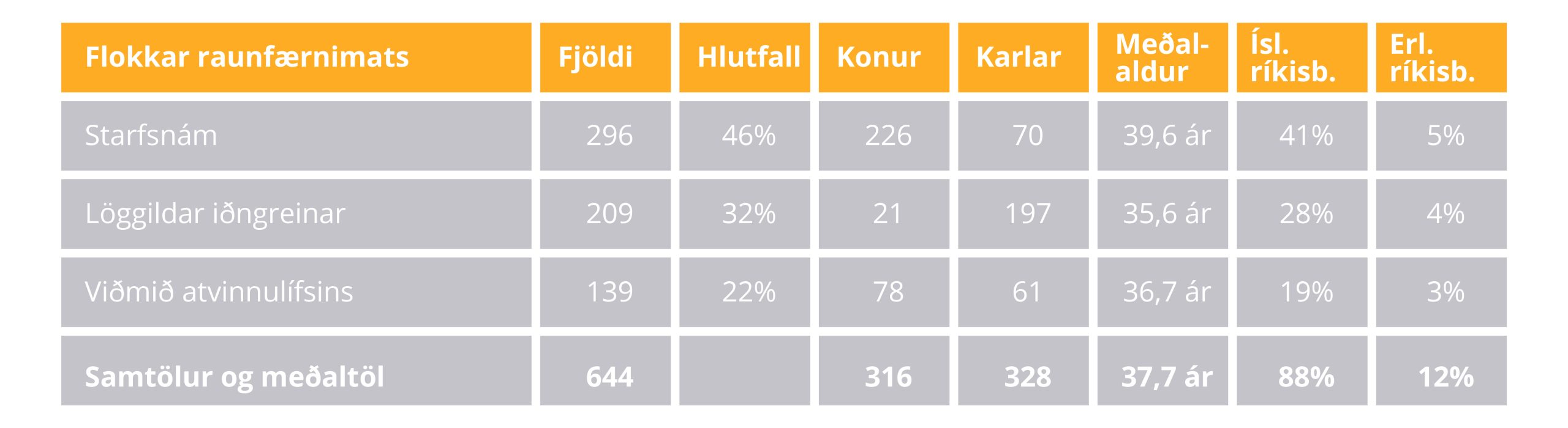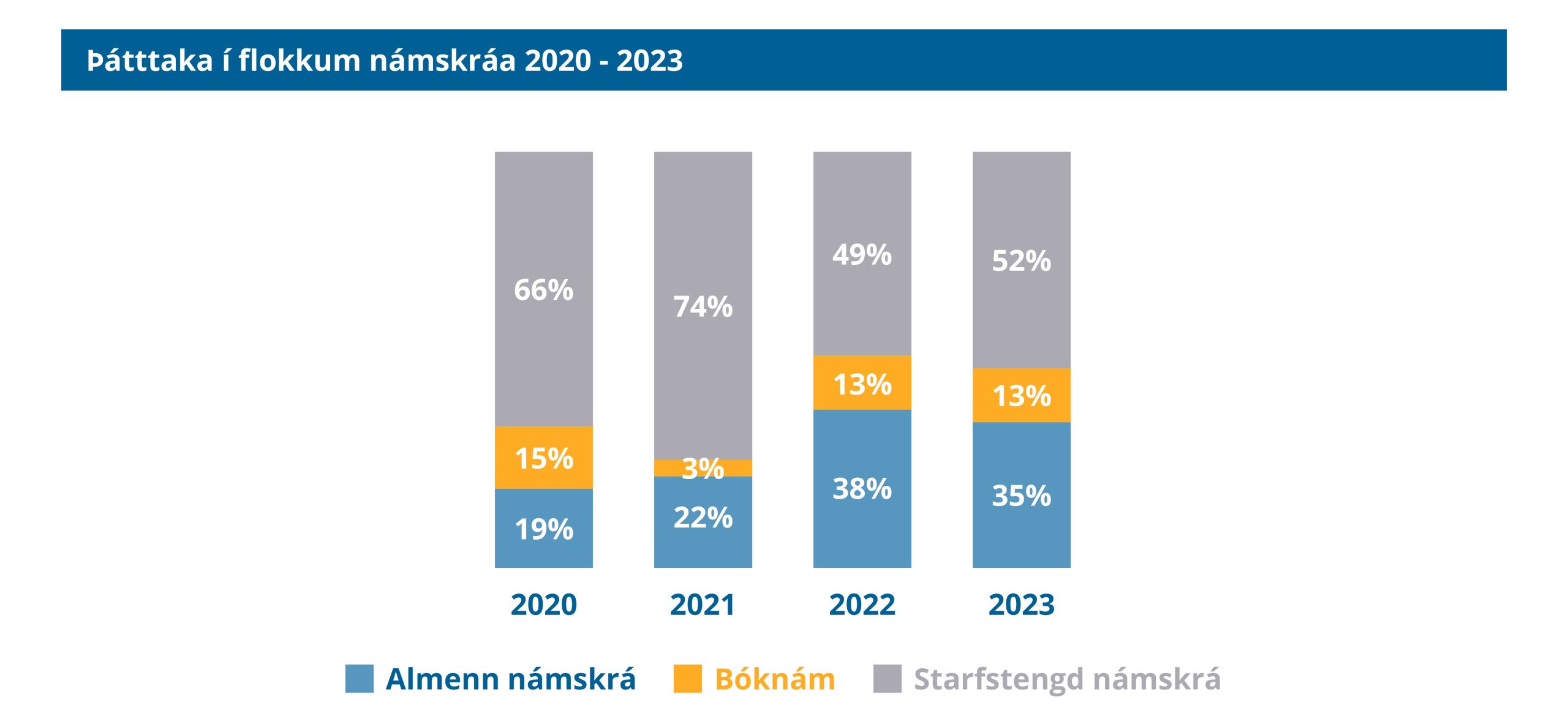 Þegar skoðað er hverskonar nám fólk sækir helst í út frá fjölda nemenda sést að starfstengt nám er algengasti flokkurinn. Eins og sjá má á töflunni hér fyrir ofan kemur í ljós að mest er sótt í starfstengt nám (í formi námskráa/námsleiða) en tiltölulega lítið í nám sem er eingöngu bóklegt.