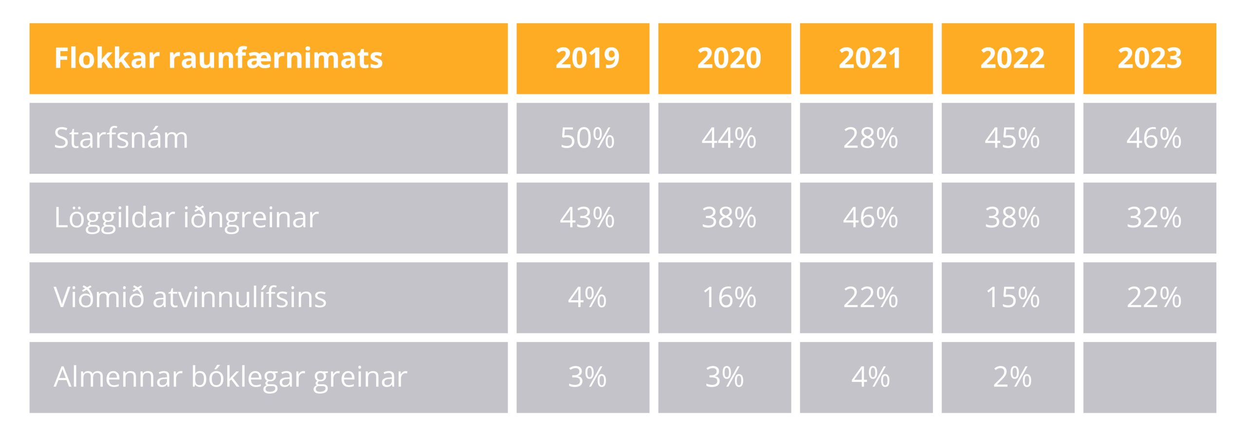 Ef tekið er meðaltal síðustu fimm ára má sjá að hlutfall þátttakenda í raunfærnimati á starfsnámsbrautum og þátttakenda í raunfærnimati í iðngreinum sem lýkur með sveinsprófi hefur jafnast. Árið 2023 var ekki boðið upp á raunfærnimat í Almennum bóklegum greinum.