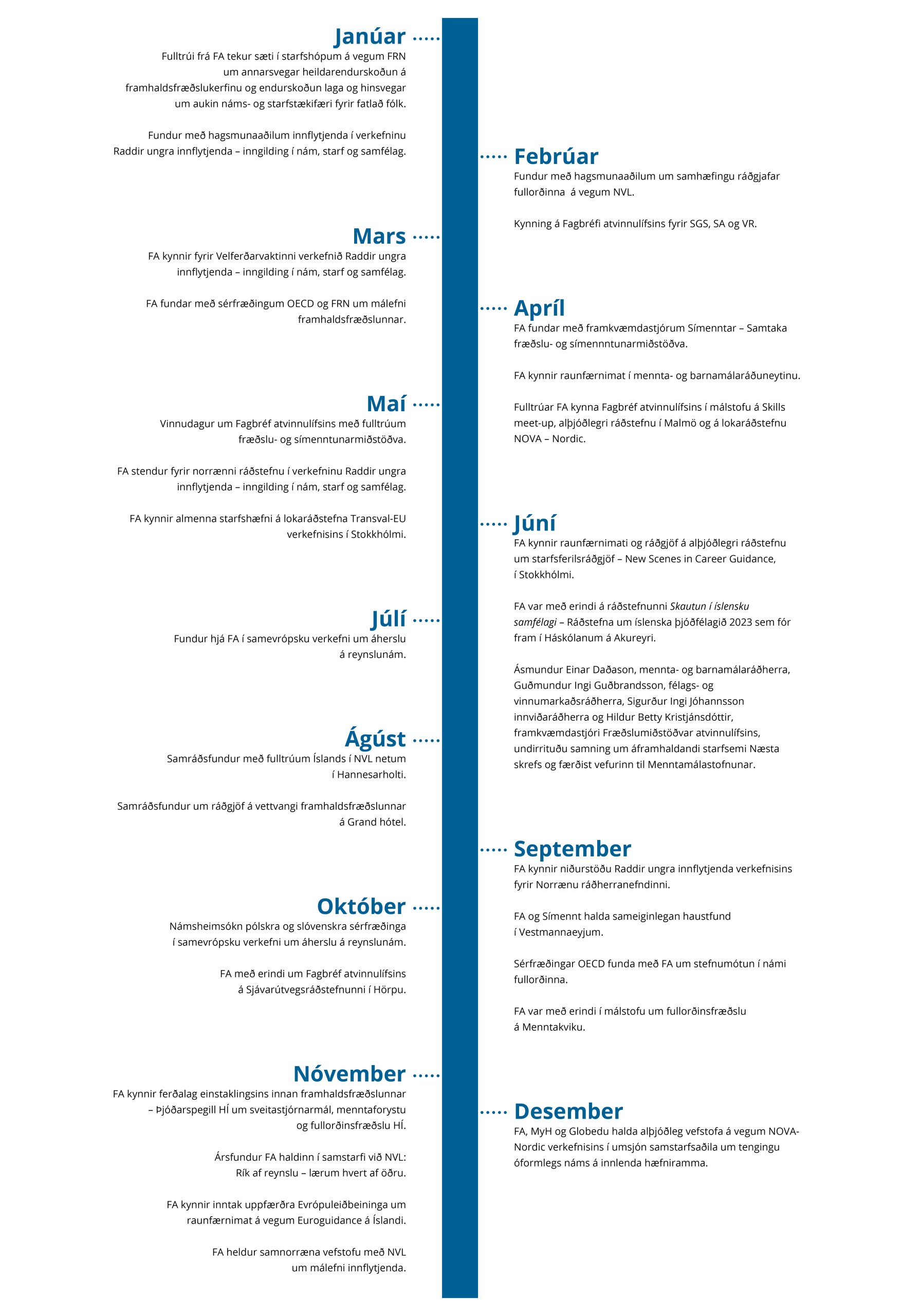 Fórir stórir viðburðir voru haldnir á árinu í umsjón FA. Auk þeirra fóru fram fjölbreyttir samráðsfundir með samstarfsaðilum, þjálfun fyrir matsaðila vegna aðferðafræði Fagbréfa atvinnulífsins, vinnustofur og námskeið fyrir fagaðila í raunfærnimati, ráðgjafa og verkefnastjóra á vettvangi framhaldsfræðslunnar. Markmiðið er alltaf að miðla reynslu, þjálfa, læra hvert af öðru og hvetja til umræðu um vettvanginn og markhóp framhaldsfræðslunnar.