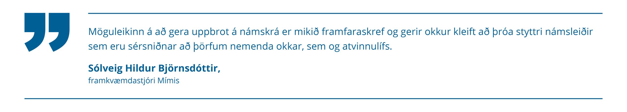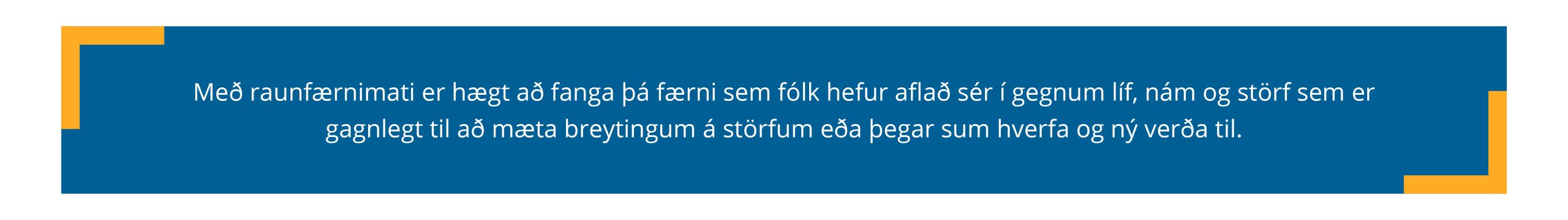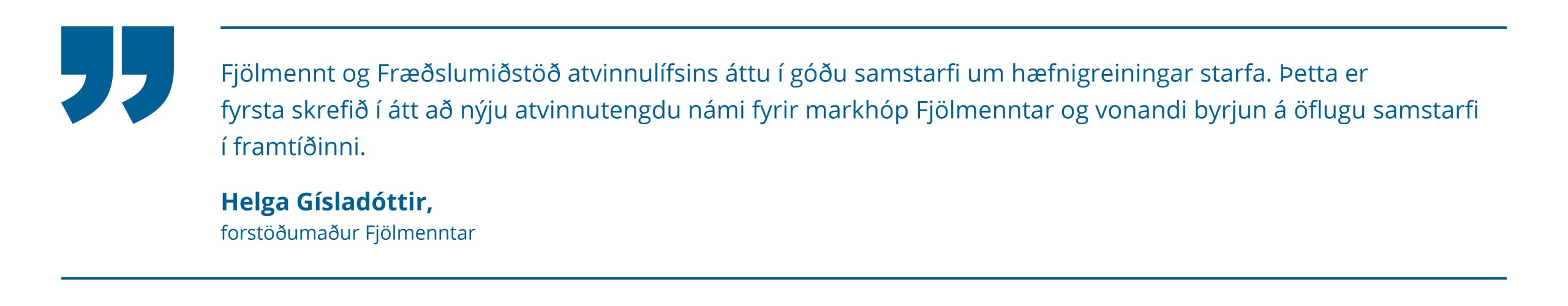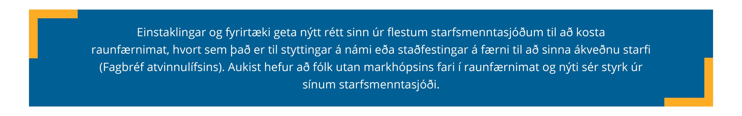 Það er ljóst að íslenskur vinnumarkaður tekur örum breytingum og tæknivæðing krefst nýrrar hæfni hratt, hraðar en formlega menntakerfið getur brugðist við. Gott samstarf og samtal við atvinnulíf um þarfir og áherslur er lykillinn að árangri. Verkfæri þarf að þróa í takt við þarfirnar, kortleggja þarf störf, rýna hæfnikröfur starfa. Leggja þarf áherslu á að menntun eigi sér ekki einungis stað innan formlegs skólakerfis heldur að einstaklingar stunda einnig nám á vegum framhaldsfræðsluaðila, hjá símenntunarmiðstöðvum, á vettvangi óháðra fræðsluaðila og á vinnustöðunum sjálfum.