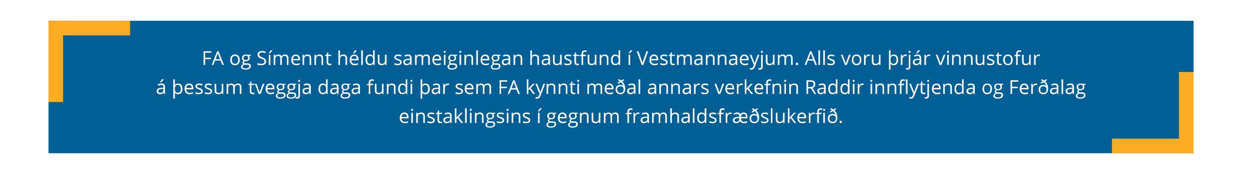 Á ársfundi FA, Rík af reynslu – Lærum af hvert öðru, var áherslan á að draga fram stöðu framhaldsfræðslunnar og framtíð hennar sem fimmtu meginstoðar menntakerfisins. Á fundinum kom fram, að margt hefur áunnist frá því lög um framhaldsfræðslu 27/2010 tóku gildi og áframhaldandi vilji er til að efla þjónustuna í átt að réttlátara samfélagi.
