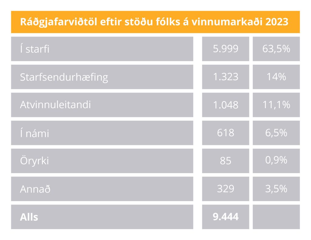 Ráðgjöfinni er ætlað að ná til markhópsins með upplýsingar og hvatningu til símenntunar. Fjöldi ráðgjafarviðtala á árinu með endurkomum var 9.444. Af þeim sem komu í ráðgjöf eru langflest í starfi eða 63,5%, 11% eru í atvinnuleit, 14% í starfsendurhæfingu og 6,5% í námi. Flestir atvinnuleitendur í ráðgjöf voru á Suðurnesjum Vesturlandi og á Vestfjörðum.