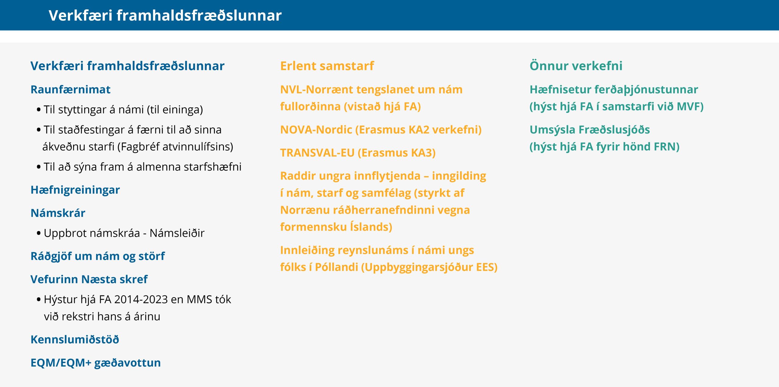 FA er leiðandi í að greina, meta og auka hæfni á íslenskum vinnumarkaði. Því er óhætt að segja að FA sé öflugur samstarfsvettvangur um fimmtu stoð menntakerfisins – framhaldsfræðsluna. Mikilvægt er að áframhald verði á því að þróaðar séu sérstakar námsleiðir fyrir fólk sem stendur fyrir utan formlega menntakerfið og mikilvægi þess að færni þessa hóps sé metin og staðfest eykst með ári hverju. Um er að ræða stóran hóp fólks sem hefur aflað sér þekkingar og færni á vinnumarkaðnum en þau verkfæri og leiðir sem FA hefur þróað henta einnig vel fyrir innflytjendur sem og fatlað fólk.